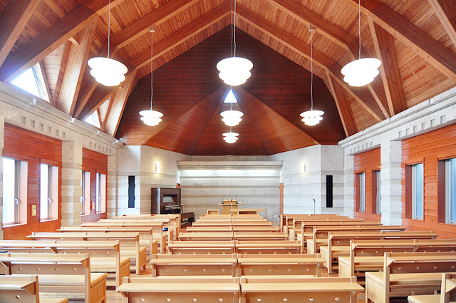 (↑)木のぬくもりを感じさせる礼拝堂。天井は高く晴れていると日の光が差し込みます。