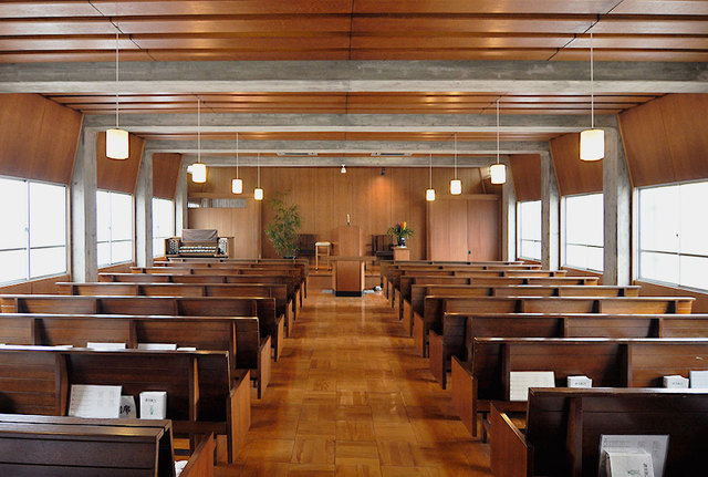 (↑)高松教会の礼拝堂です。伝統的な木製ベンチがずらりと並び、奥に牧師が説教を行う講壇(こうだん)と賛美歌を演奏するためのオルガンが見えます。