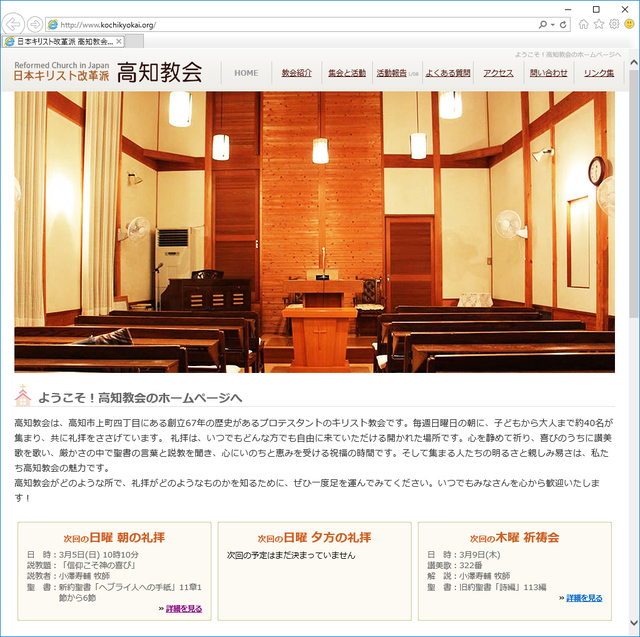 高知市上町四丁目にある創立67年の歴史があるプロテスタントのキリスト教会です。毎週日曜日の朝に、子どもから大人まで約40名が集まり、共に礼拝をささげています。 礼拝は、いつでもどんな方でも自由に来ていただ…