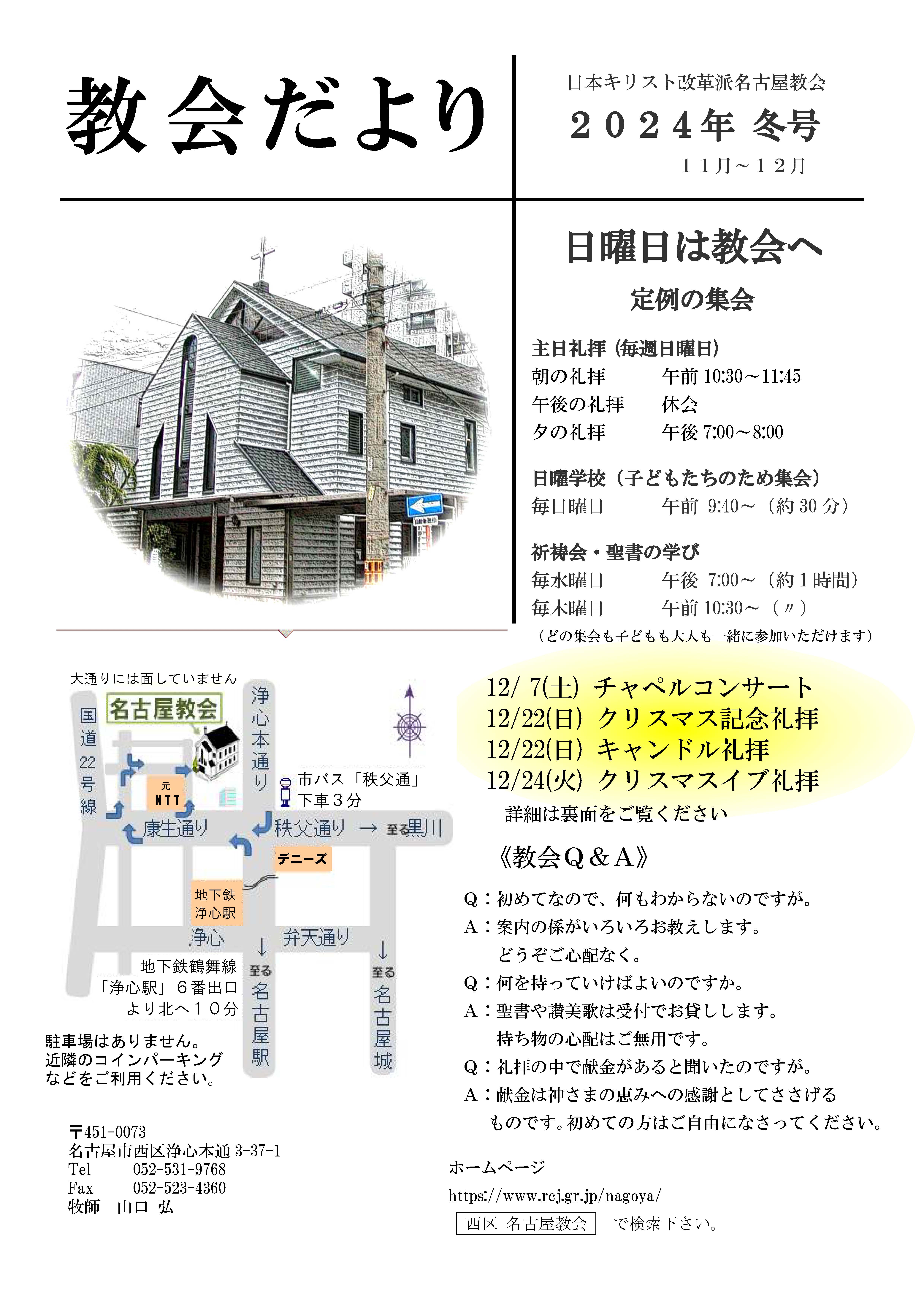 毎週日曜は礼拝の日 名古屋教会では毎週日曜日、神様への感謝と祈りをささげる礼拝を開いています。この礼拝はキリスト教に興味のある方でしたら、どなたでも自由に参加できます。お仕事などで日曜日の都合がつかない方は、毎週水曜と木曜日に行われる祈祷会(きとうかい=お祈りの会)がおすすめです。 日曜 朝の礼拝 10時30分~12時00分 必要な持ち物は特にありません。聖書や讃美歌などは教会でお貸します。 日曜 夕方の礼拝 19時00分~19時45分 朝の礼拝に出席できない方におすすめです。聖書や讃美歌などは教会でお貸します。 水曜 夜の祈祷会 19時00分~19時45分 お祈りのため集会です。聖書を学び、皆と共に祈りを捧げます。 木曜 午前の祈祷会 10時30分~11時30分 聖書を学び、皆と共に祈りを捧げます。日曜日に教会に来られない方におすすめです。 お気軽にお問い合わせを 「一度礼拝に出席してみたい。」 「教会に行ってみたい。」 「でもどうしたらよいかわからない。」 そんな時は専用の問い合わせフォームからご質問ください。担当スタッフが折り返しお返事を差し上げます。 電話でのお問い合わせなら052-531-9768まで。その際 「ホームページを見たのですが」 とお伝えくださると話が通じやすくなります。