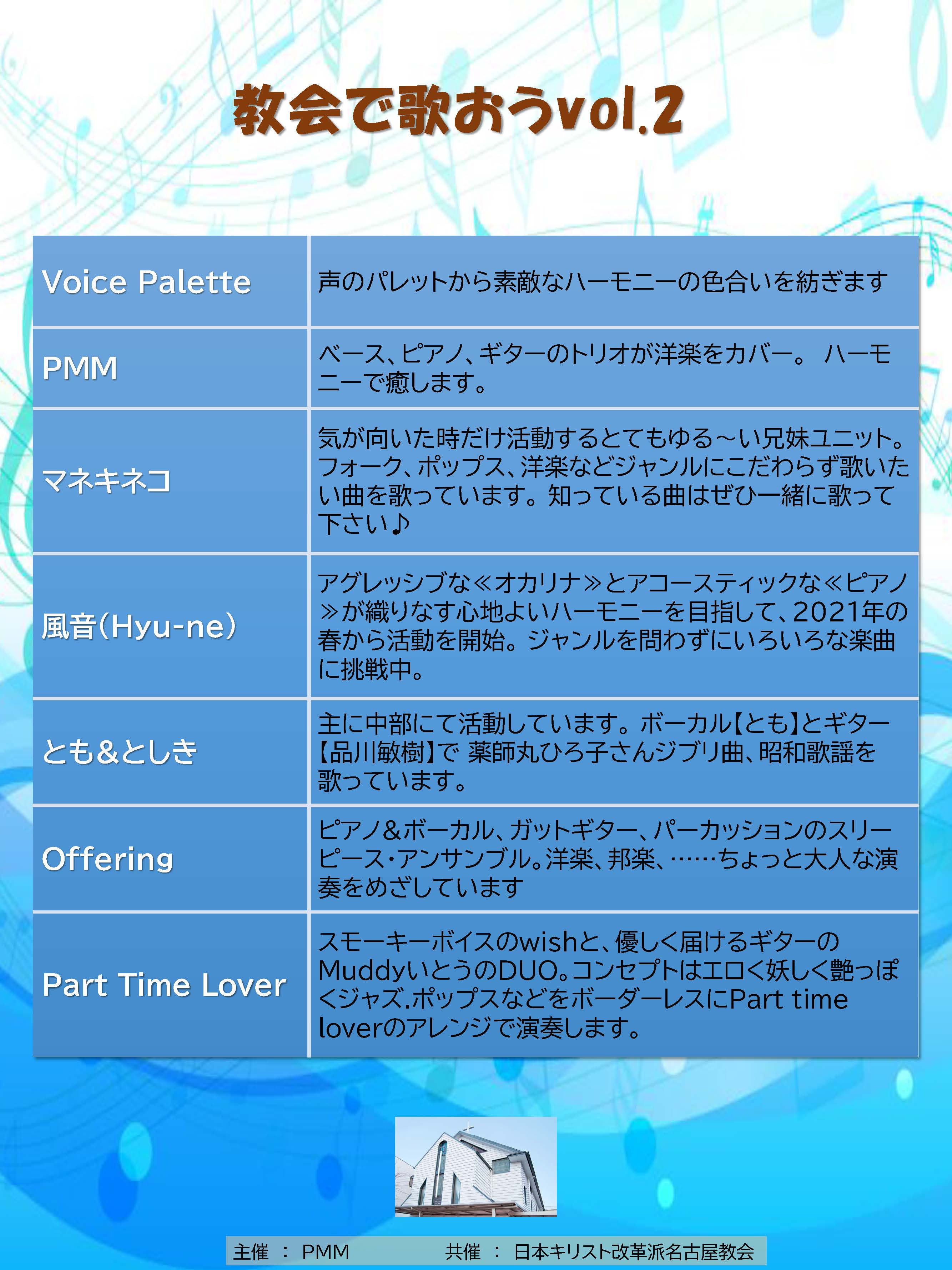 11/1『教会で歌おうvol.2』に是非おいでください 掲載日:2025年10月28日 PMMのみなさんの主催で、今年も『教会で歌おうVol2』が行われます。 是非おいでください。 教会ライブ2025フライヤーh_ページ_1.jpg 教会ライブ2025フライヤーh_ページ_2.jpg 名古屋教会の礼拝出席に事前予約などは必要ありません。しかし 「車で行くので駐車場の案内をしてほしいです。」 「子供連れで行きたいので母子室を利用したいのですが…」 「なるべく前のほう(後ろのほう)の席に座りたいです。」 などなど、初めての礼拝出席においてあらかじめリクエストやご質問がある方は、礼拝参加予約フォームからその旨お伝えいただくと、当日の受付案内がよりスムーズに行えます。 礼拝参加を予約する