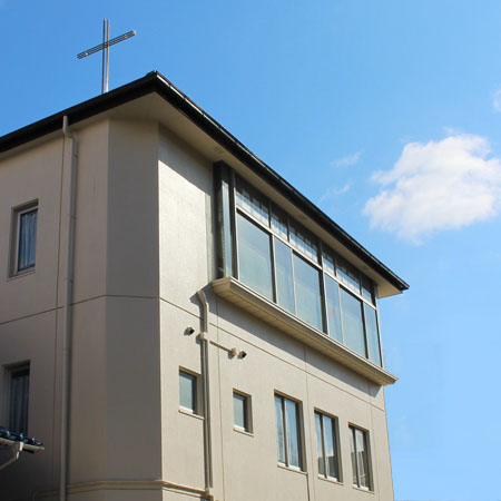大阪モノレール「山田」駅で下車。モノレール沿いにしばらく歩くと、左手に3階建ての教会が見えてきます。