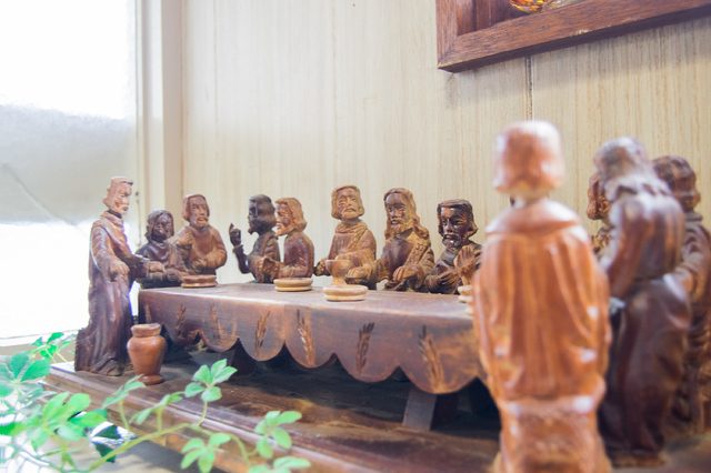 (↑)教会の玄関わきに置かれた置物。イエス・キリストと使徒たちの「最後の晩餐」の木彫りのオブジェです。よく「この人形がイエス・キリストで…。」「この人形は誰だ?」と皆で盛り上がっています。