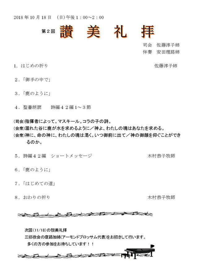 - 必要な持ち物は特にありません。聖書や讃美歌などは教会でお貸します。