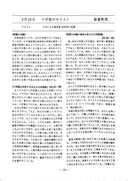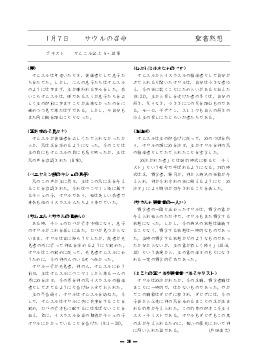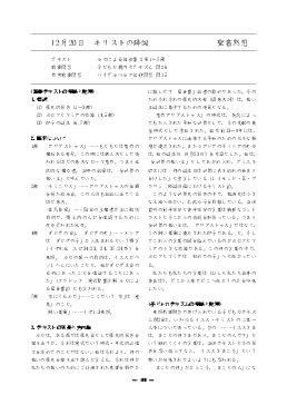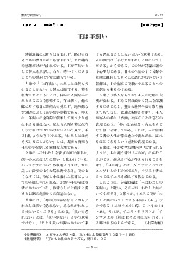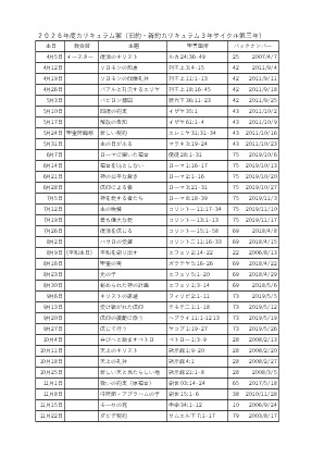 年月日 教会歴・行事 聖書箇所 タイトル 添付ファイル 2028/03/31 創世記- 26年度救済史カリキュラム 2026/03/31 創世記- 2025全体カリキュラム 2026/03/29 受難週 ルカによる福音書23:32-23:43 十字架のキリスト 2026/03/22 サムエル記下7:1- ダビデへの契約 2026/03/15 サムエル記上20:1- ダビデとヨナタン 2026/03/08 サムエル記上17:1- ダビデとゴリアト 2026/03/01 サムエル記上16:1- ダビデの召命 2026/02/22 受難節 サムエル記上9:1- サウルの召命 2026/02/15 サムエル記上3:1- サムエルの召命 2026/02/08 ルツ記2:1- ルツとボアズ 2026/02/01 ルツ記1:1- ナオミとルツ 2026/01/25 士師記16:1- サムソン 2026/01/18 士師記7:1- ギデオンの精鋭 2026/01/11 ヨシュア記6:1- エリコの攻略 2026/01/04 新年 詩編23:1- 主は羊飼い 2025/12/28 ルカによる福音書2:22-2:35 神殿で献げられる 2025/12/21 クリスマス ルカによる福音書2:1-2:7 キリストの降誕 2025/12/14 待降節③ ルカによる福音書1:39-1:55 マリアの賛歌 2025/12/07 待降節② ルカによる福音書1:26-1:38 マリアへの告知 2025/11/30 待降節① ルカによる福音書1:5-1:25 ザカリアとエリサベト 2025/11/23 ヨシュア記3:1- ヨルダン川を渡る 2025/11/16 申命記34:1-34:12 モーセの死 2025/11/09 民数記13:1- 荒れ野の放浪 2025/11/02 出エジプト記40:1- 幕屋の建設 2025/10/26 宗教改革記念日 出エジプト記32:1- 金の子牛の事 2025/10/19 出エジプト記19:1-20:21 十戒を授かる 2025/10/12 出エジプト記16:1- 天からのパン 2025/10/05 出エジプト記14:1- 葦の海を渡る 2025/09/28 出エジプト記7:8-7:24 十の災いと過ぎ越し 2025/09/21 出エジプト記3:1-3:22 モーセの召命 2025/09/14 創世記1:22-2:10 モーセの誕生 2025/09/07 創世記50:15-50:21 摂理の主の勝利 2025/08/31 創世記41:1-41:44 総理大臣になったヨセフ 2025/08/24 創世記37:1-37:36 売られたヨセフ 2025/08/17 創世記27:01-27:40 ヤコブとエサウ 2025/08/10 平和主日 ゼカリヤ書09:09-09:10 平和を実現する 2025/08/03 使徒言行録27:01-27:44 ローマへの出発 2025/07/27 創世記21:01-21:36 パウロの逮捕 2025/07/20 使徒言行録17:16-17:33 アレオパゴスで語る 2025/07/13 創世記16:11-16:40 フィリピでの宣教 2025/07/06 創世記11:19-11:30 世界を目指すアンティオキア教会 2025/06/29 使徒言行録09:01-19 サウロを回心させる復活のキリスト 2025/06/22 使徒言行録7:1-7 御言葉をめぐって整えられる奉仕者 2025/06/15 使徒言行録3:1-10 ペトロとヨハネの働き 2025/06/08 ペンテコステ ヨハネによる福音書20:19-20:23 聖霊を受けなさい 2025/06/01 ヨハネによる福音書11:1-11:44 ラザロを生き返らせる 2025/05/25 ヨハネによる福音書09:01-09:12 生まれつきの盲人のいやし 2025/05/18 ヨハネによる福音書06:01-06:15 5000人の給食 2025/05/11 ヨハネによる福音書05:01-05:18 ベトザタの池での癒し 2025/05/04 ヨハネによる福音書12:03-12:06 役人の息子のいやし 2025/04/27 ヨハネによる福音書2:1-12 カナの婚礼 2025/04/20 イースター ヨハネによる福音書20:19-23 復活のキリスト 2025/04/13 受難週 ヨハネによる福音書19:17-30 十字架のキリスト 2025/04/06 ヨハネによる福音書13:12-20 愛の歩み 2025/03/30 創世記22:1-22:19 イサク奉献 2025/03/23 創世記19:1-19:29 ソドムとゴモラ 2025/03/16 創世記17:1-17:27 割礼 2025/03/09 受難節 創世記15:1-15:21 アブラハムへの約束 2025/03/02 創世記11:27-12:9 アブラムの召命 2025/02/23 創世記11:1-11:9 バベルの塔 2025/02/16 創世記8:1-9:17 虹の契約 2025/02/09 創世記6:1-7:24 ノアの箱舟 2025/02/02 創世記4:1-4:16 カインとアベル 2025/01/26 創世記3:1-3:24 罪と堕落 2025/01/19 創世記1:26-2:15 人間の務め 2025/01/12 創世記1:26-1:31 人間の創造 2025/01/05 新年 創世記1:1-2:3 天地創造 2024/12/29 マタイによる福音書2:1-2:23 エジプトへ逃れる 2024/12/22 クリスマス マタイによる福音書2:1-2:12 東方の学者たち 2024/12/15 待降節③ マタイによる福音書1:18-1:25 罪からの救い主 2024/12/08 待降節② マタイによる福音書1:18-1:25 ヨセフへの告知 2024/12/01 待降節① マタイによる福音書1:1-1:17 待降・キリストの系図 2024/11/24 ルカによる福音書18:9-18:14 ファリサイ人と徴税人 2024/11/17 ルカによる福音書15:11-15:32 放蕩息子 2024/11/10 ルカによる福音書15:1-15:7 見失った羊のたとえ 2024/11/03 ルカによる福音書10:25-10:37 善きサマリア人 2024/10/27 宗教改革 マタイによる福音書25:14-25:30 タラントンのたとえ 2024/10/20 マタイによる福音書25:1-25:13 十人のおとめ 2024/10/13 マタイによる福音書20:1-20:16 ブドウ園の労働者 2024/10/06 マタイによる福音書13:44-13:52 天の国のたとえ 2024/09/29 マタイによる福音書13:1-13:23 種まきのたとえ 2024/09/22 ルカによる福音書10:1-10:20 72人を派遣する 2024/09/15 マタイによる福音書18:1-18:5 天の国でいちばん偉い者 2024/09/08 マタイによる福音書17:1-17:13 山上の変貌 2024/09/01 ルカによる福音書8:26-8:39 レギオンを追い出す 2024/08/25 ヨナ書4- とうごまの木とヨナ 2024/08/18 ヨナ書3- ニネべで宣べ伝えるヨナ 2024/08/11 平和主日 マタイによる福音書5:9- 平和主日 2024/08/04 ヨナ書2- 魚の腹の中のヨナ 2024/07/28 ヨナ書1- 逃げ出したヨナ 2024/07/21 ルカによる福音書7:36-8:3 夫人の癒しと奉仕 2024/07/14 ルカによる福音書7:11-7:17 やもめの息子の復活 2024/07/07 ルカによる福音書7:1-7:10 百人隊長の僕の癒し 2024/06/30 ルカによ