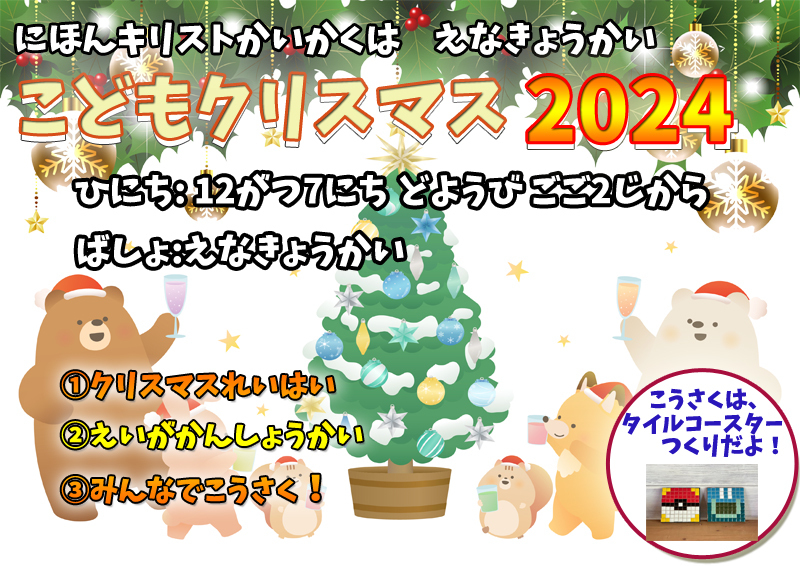 2024年12月7日(土)こどもクリスマスのご案内 掲載日:2024年11月28日 2024年12月7日(土)午後2時より、教会学校主催のこどもクリスマスを行います。お友達やご家族を誘って、ぜひ来てください! https://www.rcj.gr.jp/ena/thumbnail.php?id=247_1.jpg この記事に添付ファイルはありません 恵那キリスト教会の礼拝出席に事前予約などは必要ありません。しかし 「車で行くので駐車場の案内をしてほしいです。」 「子供連れで行きたいので母子室を利用したいのですが…」 「なるべく前のほう(後ろのほう)の席に座りたいです。」 などなど、初めての礼拝出席においてあらかじめリクエストやご質問がある方は、礼拝参加予約フォームからその旨お伝えいただくと、当日の受付案内がよりスムーズに行えます。 礼拝参加を予約する