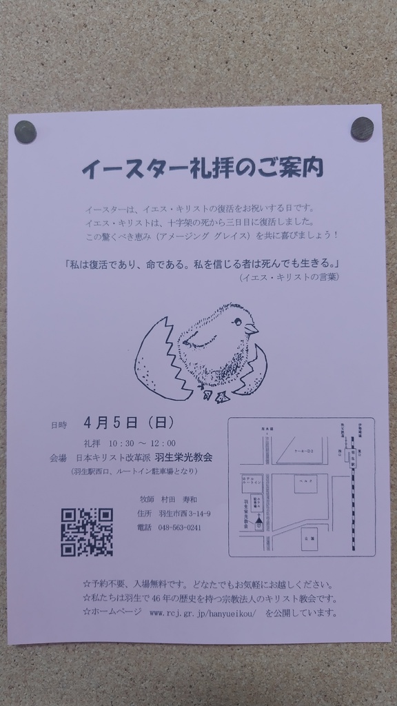 むらた「4月5日(日)は、イエス・キリストの復活を祝うイースターの礼拝です。どうぞお越しください。」