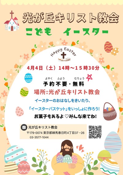 4月4日(土)こどもイースター 掲載日:2026年03月28日 4月4日(土)こどもイースター 14:00〜15:30 イースターのおはなしをきいたり 『イースターバスケット』をいっしょにつくろう! おかしもあるよ♡みんなきてね! 4月4日(土)こどもイースター14:00〜15:30イースターのおはなしをきいたり『イースターバスケット』をいっしょにつくろう!おかしもあるよ♡みんなきてね! ↓この記事には添付ファイルがあります↓ 1774659268806.jpg
