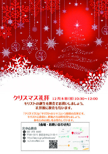 クリスマス礼拝のお知らせ 掲載日:2024年12月08日 「クリスマス」は「キリストのミサ」という意味です。おさな子キリストに出会う時となりますように。 クリスマス礼拝 12月8日(日)10:30~12:00 キリストの誕生を教会でお祝いしましょう。あなたのお越しをお待ちしています。 ↓この記事には添付ファイルがあります↓ getRipOrderPdfImg.jpg