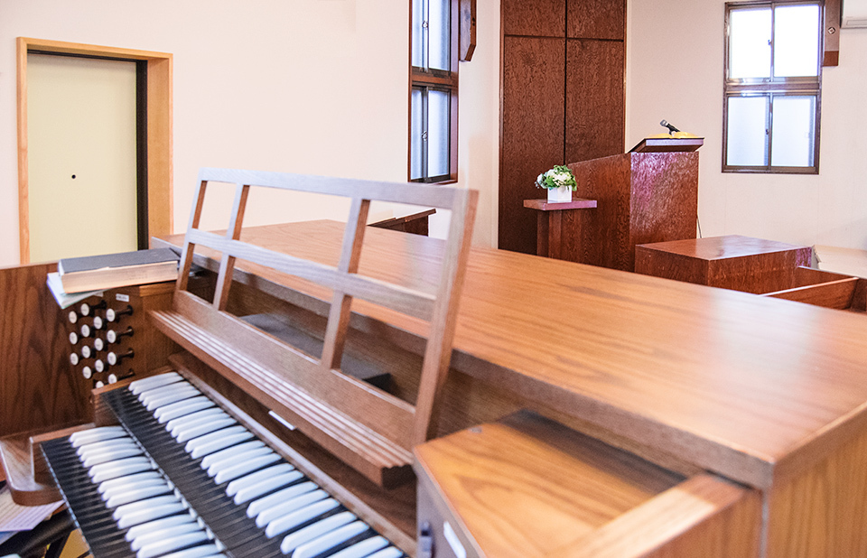 モリー「教会に欠かせないのがオルガンです。讃美歌などの奏楽に使われます。新座志木教会のオルガンはご覧のようにクラシカルな木製の外観をしています。鍵盤の黒と白が逆なのが特徴的です。」