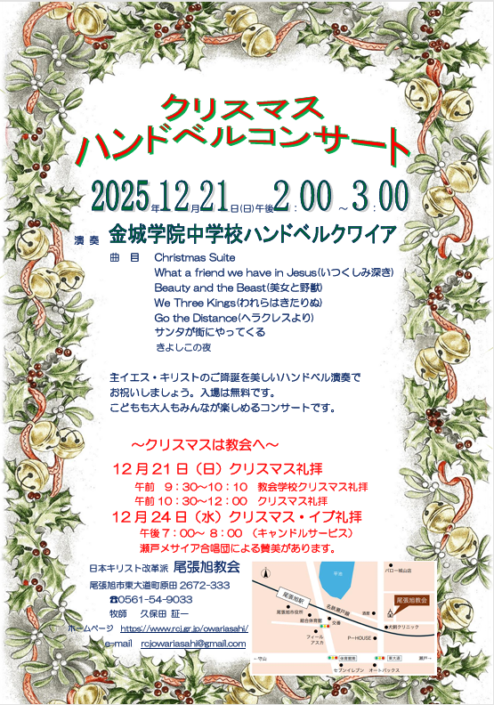 2025 クリスマスハンドベルコンサート 掲載日:2025年12月20日 2025.12.21(日)14:00~15:00 演奏:金城学院中学校ハンドベルクワイアの皆さん。 入場無料です。 美しいハンドベルの演奏を聞いて、クリスマスを祝いましょう。 ↓この記事には添付ファイルがあります↓ 2025.12 ハンドベルコンサート 案内チラシ.png