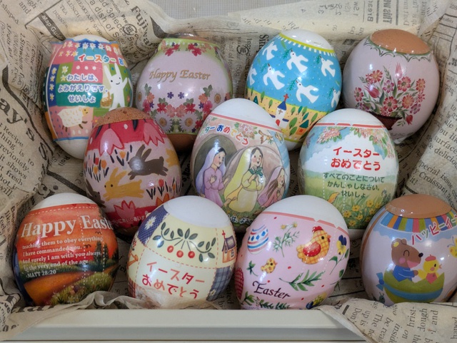 「4/5は、イ―スター礼拝でした。かわいいゆで卵がくばられました。イエス様の復活の命の象徴として…。」